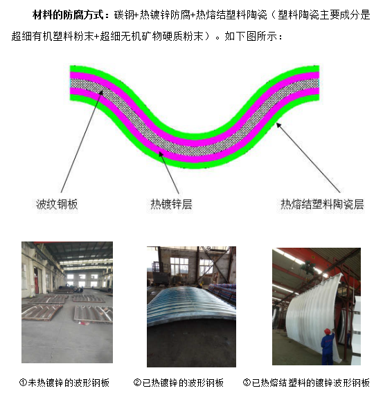 2010年,針對各地公路用熱鍍鋅波紋鋼管涵洞的腐蝕條件和行業(yè)防腐要求, 我公司與中國防腐蝕協(xié)會及南京工業(yè)大學(xué)、南京工程學(xué)院、中國石化集團(tuán)金陵石化公司等單位合作研究,借鑒及創(chuàng)新了其它領(lǐng)域的高壽命的成熟防腐技術(shù),將有機(jī)材料與無機(jī)超硬質(zhì)礦物材料融合,成功的取得了埋地用鋼結(jié)構(gòu)的熱浸鍍鋅加熱熔結(jié)塑料陶瓷的綜合防腐技術(shù),并已在國內(nèi)高速公路埋地式鋼質(zhì)波紋管涵洞結(jié)構(gòu)中運(yùn)用,效果顯著,獲得行業(yè)好評。2017 年,該項技術(shù)獲得南京市人民政府頒發(fā)的科技進(jìn)步二等獎。