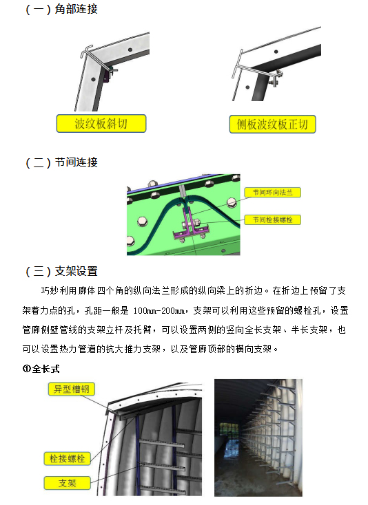 四個連接角為鈍角結構,沒有圓弧角的弧度卷圓限制,可以使用大波高、大慣性矩 的波紋鋼板,大大提高了廊體的強度,同樣的鋼材用量卻能使管廊板壁的慣性矩比“涵洞型” 波紋鋼管廊提高 5.3~7.7 倍;
