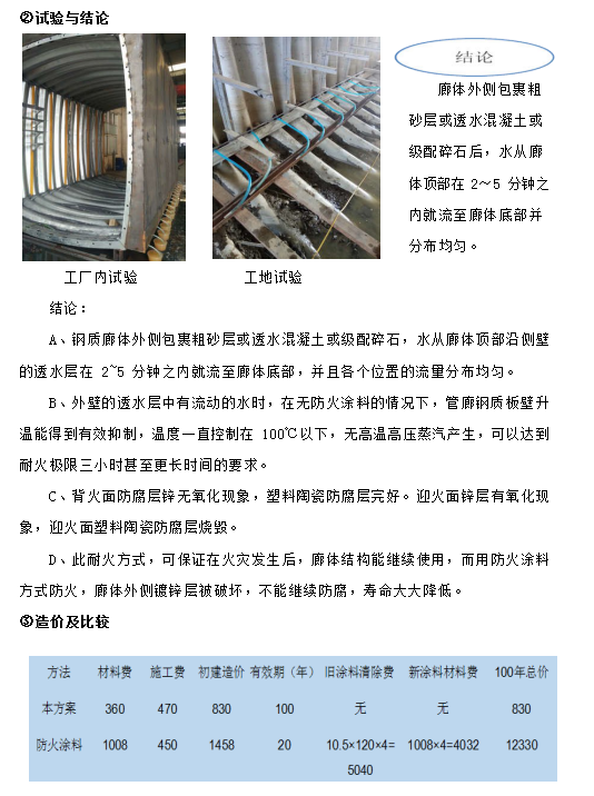 ⑨ 應對耐火極限三小時的方式是涂耐火涂料,但耐火涂料壽命只有 10~20 年, 并且不能長期耐潮,在壽命到期失效后重新涂刷時,由于內部管線及設施的存在, 清除殘余失效涂層的工作量大,涂刷新涂層更繁雜,費用較初次施工時大大增加, 并且在管廊整個壽命周期內要多次更換防火涂層;更為重要的是,耐火涂料只能阻止火災時鋼結構的溫度不高于 550℃,但對于鋼結構地下管廊來說情況特殊,在火災發生半小時左右,耐火涂料覆蓋的鋼結構體溫度就超過 150℃,廊體外部土壤中的水份形成高溫高壓蒸汽,其產生的次生災害有可能嚴重于火災本身。